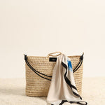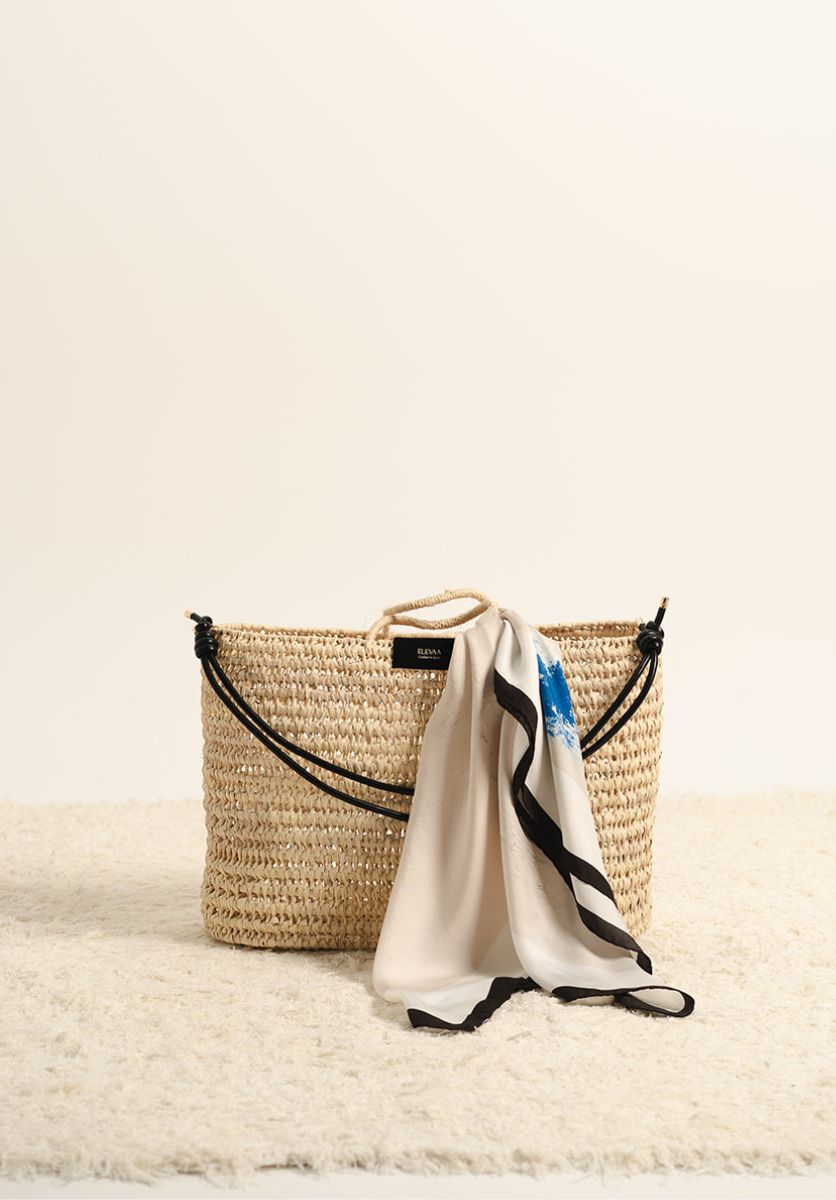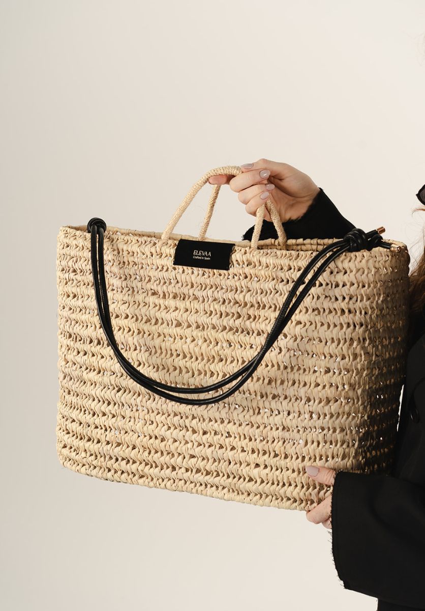- Features hand grips in natural fibre and adjustable leather shoulder strap