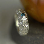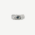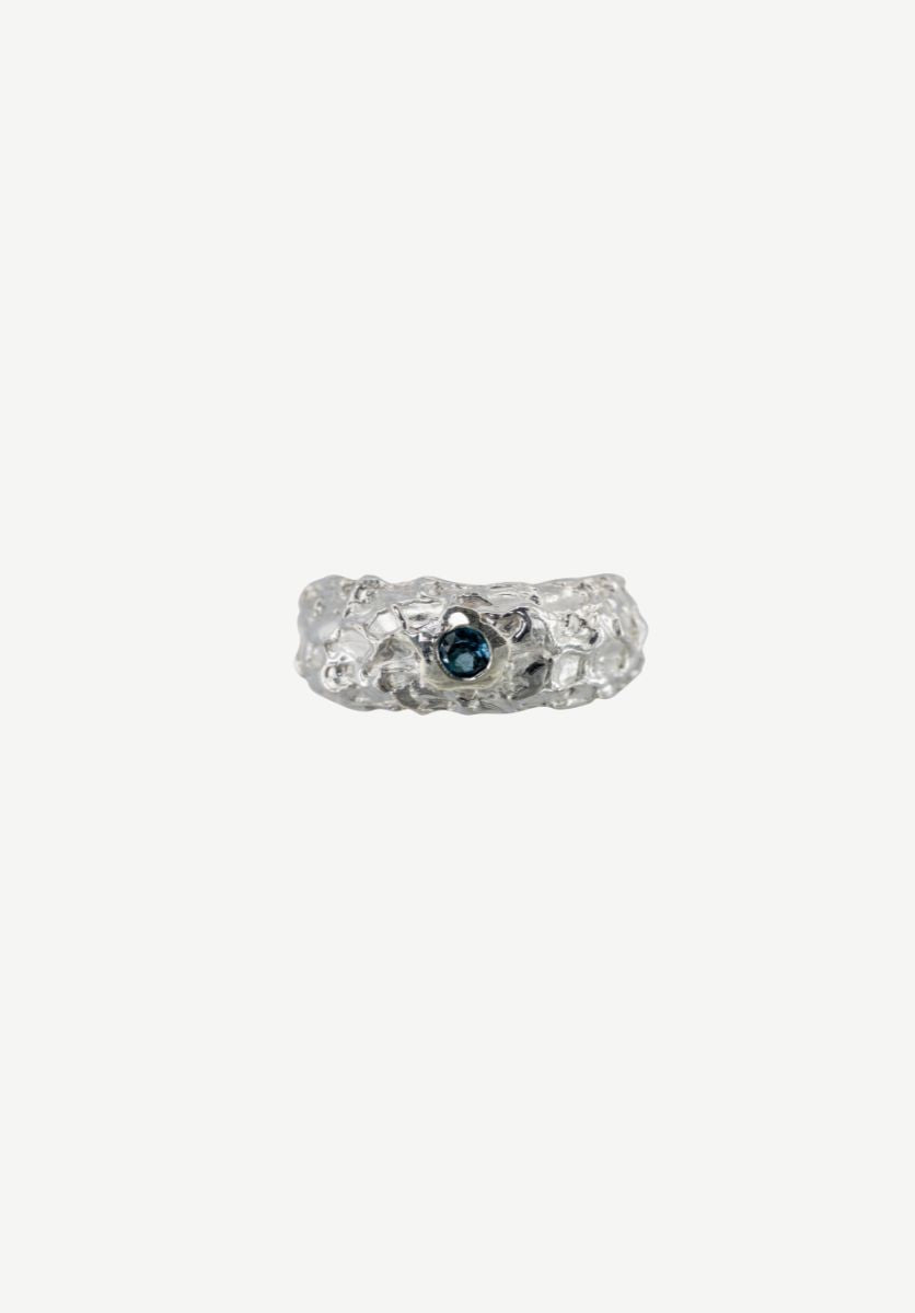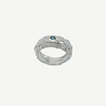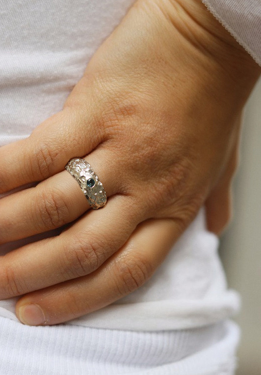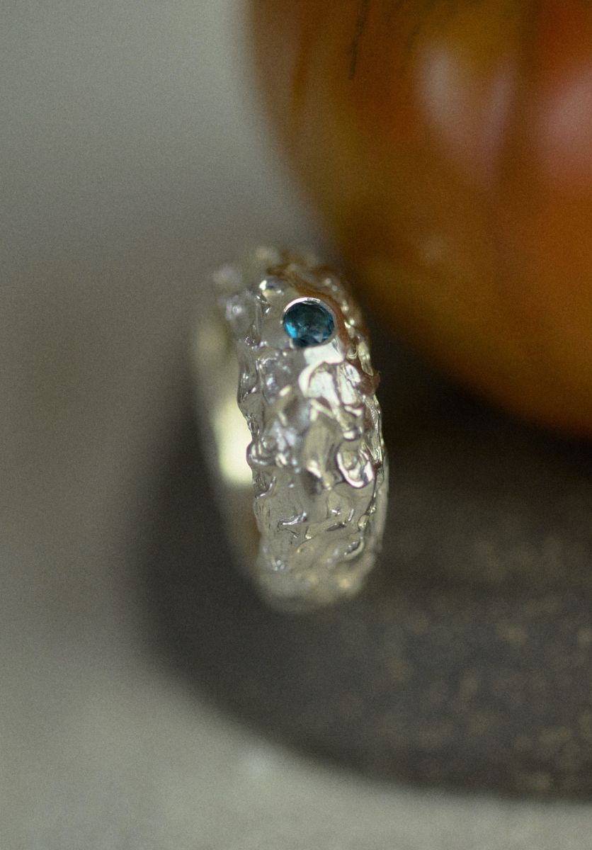 Inspired by the natural formation of rocks, the Roccia ring carries the marks of time and the elements. Its irregular texture gives it a raw, organic presence, while a small natural London Topaz set on the top adds a touch of light and quiet strength.