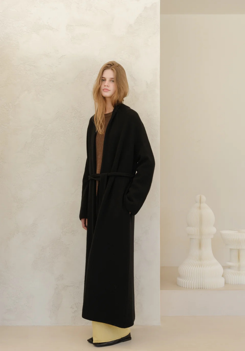 The Cashmere mix coat is an Italian-made design that combines comfort with quiet elegance. Made from a soft wool and cashmere blend, it feels warm yet lightweight. The wrap silhouette, adjustable belt, and wide cuffs create a relaxed fit, making this cashmere coat a versatile piece for everyday wear.