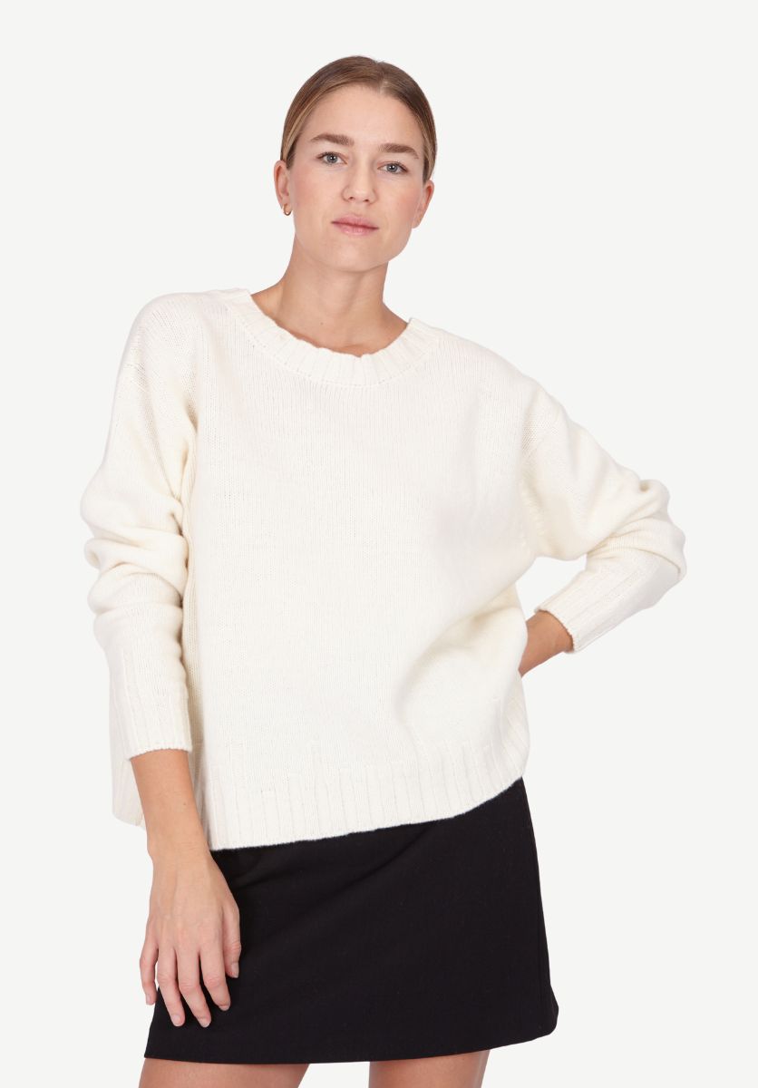 V-neck wool-blend sweater crafted in Italy, combining softness and refined design. With a straight cut and medium length, it features asymmetrical hems on the cuffs and bottom for a contemporary touch. The reversible neckline can be worn at the front or back, offering two styling options in one timeless knit. A versatile sweater designed for everyday wear and sustainable wardrobes.