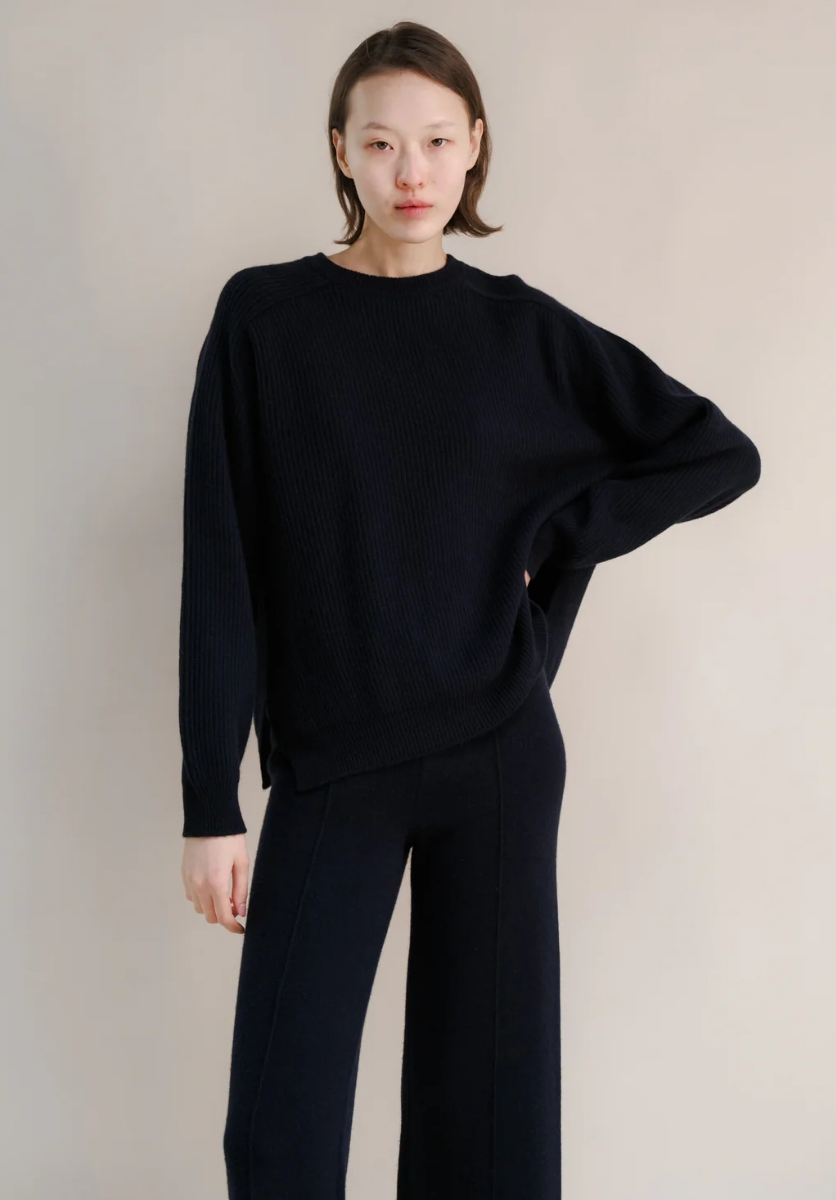Cashmere mix crewneck ribbed sweater navy