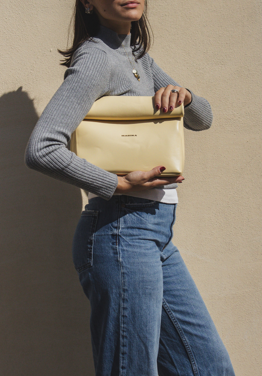 A refined tribute to the classic lunch bag, Nilde clutch blends everyday practicality with a distinctive silhouette. Soft yet structured, it’s designed to follow you through the day with effortless elegance. The rolled handle with magnetic closure ensures comfort and security, while the double base adds shape and stability.
