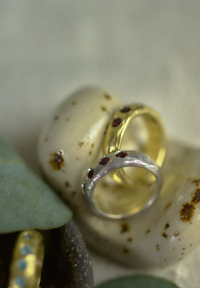 Set with four natural red garnets, this ring carries quiet strength and layered meaning. Perfect as a pinky ring or worn as a midi ring, it adds a touch of individuality to any look.