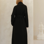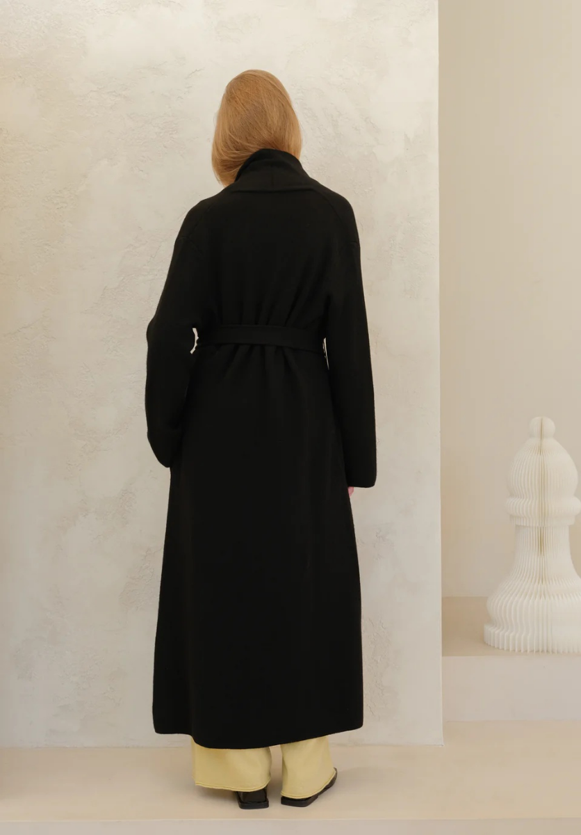 The Cashmere mix coat is an Italian-made design that combines comfort with quiet elegance. Made from a soft wool and cashmere blend, it feels warm yet lightweight. The wrap silhouette, adjustable belt, and wide cuffs create a relaxed fit, making this cashmere coat a versatile piece for everyday wear.