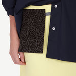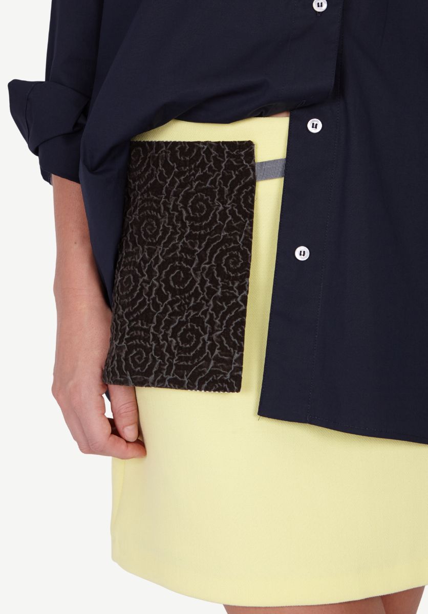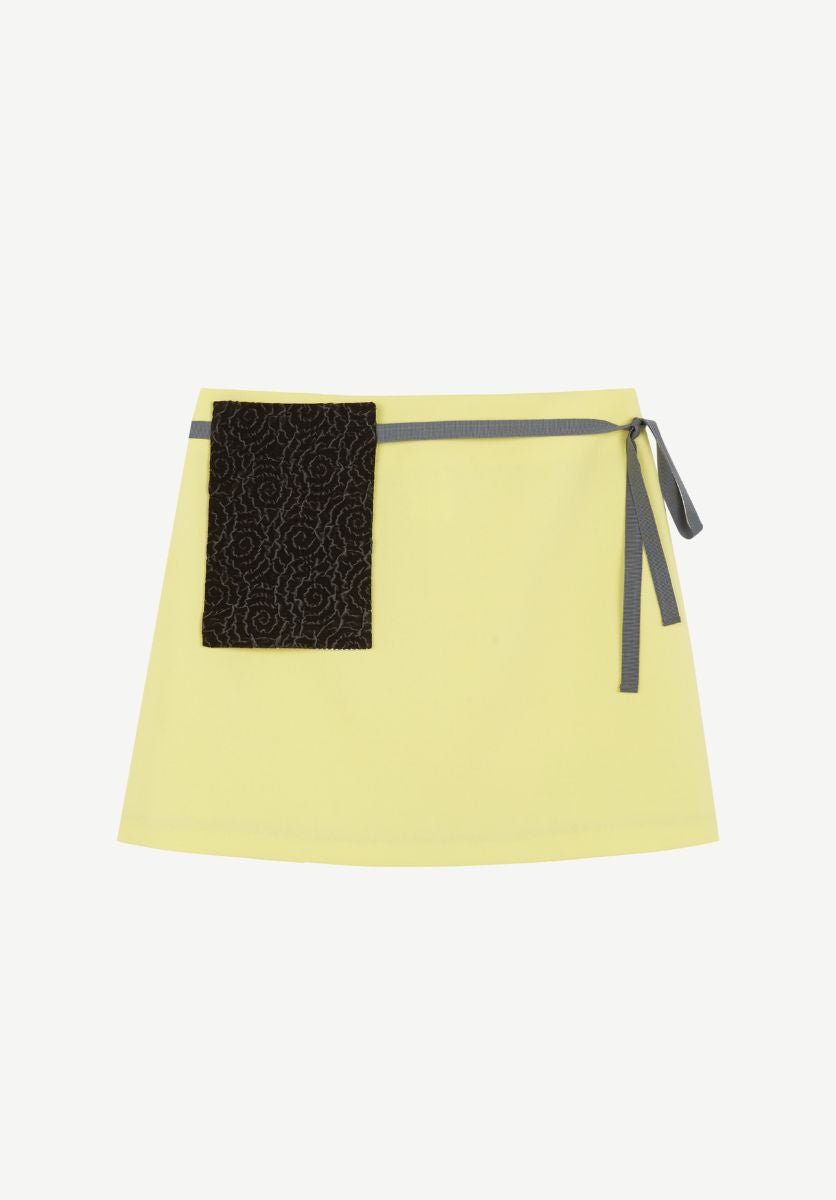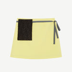 This mini skirt is crafted in a subtle A-line silhouette with a mid-rise waist and a clean side zip closure. Its unique removable pocket can be detached or reversed, revealing two different patterns, each finished with striped lining on the back. The result is a versatile piece that balances a minimalist cut with an unexpected detail, adapting seamlessly to different looks.