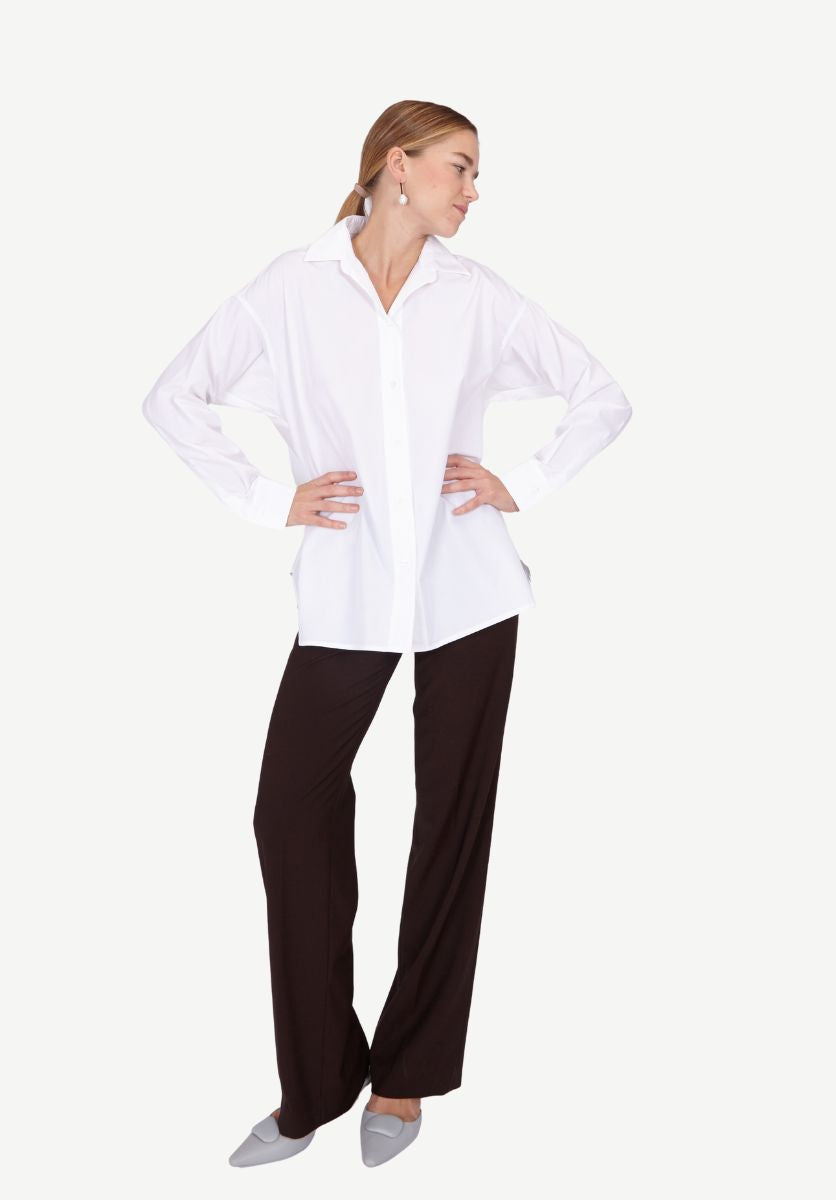 With dropped shoulders and a flared silhouette, this shirt drapes effortlessly, while the asymmetric hem, longer in the back, adds gentle movement and depth. A unique button on the left side allows you to wrap and fasten the shirt in different ways, offering versatile styling options in one timeless piece.
