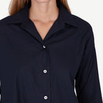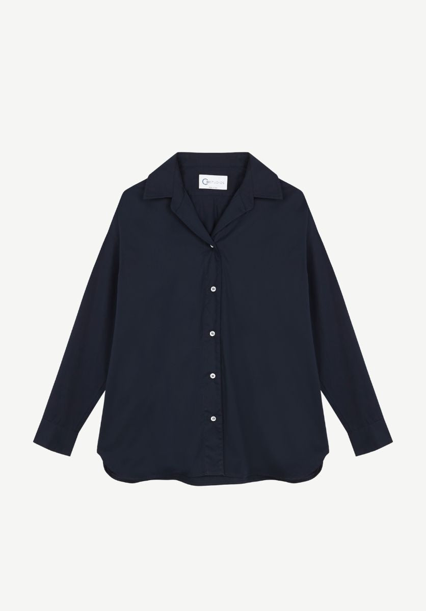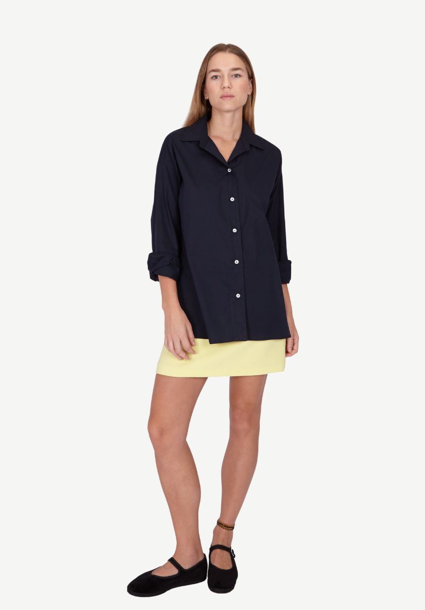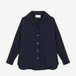 With dropped shoulders and a flared silhouette, this shirt drapes effortlessly, while the asymmetric hem, longer in the back, adds gentle movement and depth. A unique button on the left side allows you to wrap and fasten the shirt in different ways, offering versatile styling options in one timeless piece.