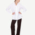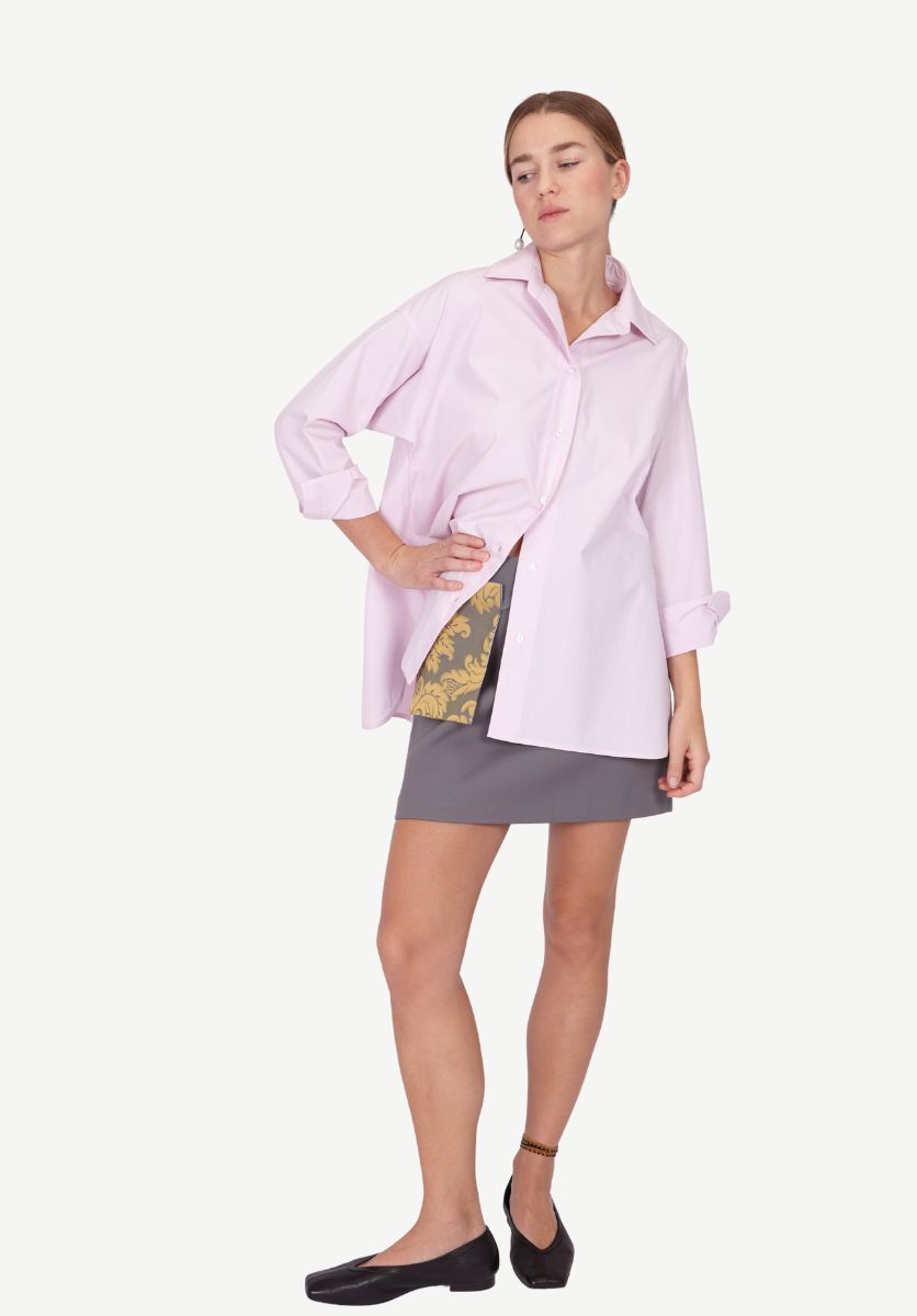 With dropped shoulders and a flared silhouette, this shirt drapes effortlessly, while the asymmetric hem, longer in the back, adds gentle movement and depth. A unique button on the left side allows you to wrap and fasten the shirt in different ways, offering versatile styling options in one timeless piece.
